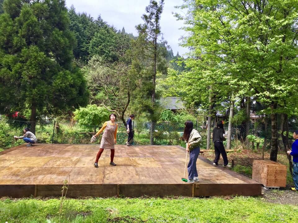 2日目も朝からD.I.Y。天気がいい。みんな6時前には自然と起き出して、竈に火を起こしてご飯作り。食卓の準備。ドイツ人宮大工Peter Parsh さんが9時に到着。9時半から2日目の作業開始。昨日もたついていた作業も1日やるとみんな手慣れたもので、作業のスピードもアップ。進捗が目に見えるのはやる気が出る。ご飯作り担当も全員で回す。2日目になるとある生活リズムが生まれて来て、言われてやるのではなく、それぞれが気がついた事や出来る事をやるという、静かで親密な心地よい空気がグループに生れている。この日は夕方には燐光群の桐畑理佳さんが到着予定。本当は初日からの参加を表明してくれていたが、直前にアクシデントが発生し一時は参加断念。でも何とかやりくり付けて2日目の夕方に到着してくれました。バス停に迎えに行く。続いて自分の車で現れたAsh(カワサキアリス代表)2015年以来2度目の芦見谷登場。昨年のGW燐光群企画の「楽屋フェス」では女優B役で、おででこの楽屋に参加。この芦見谷で「楽屋フェス」繋がり3人が同時に再会。